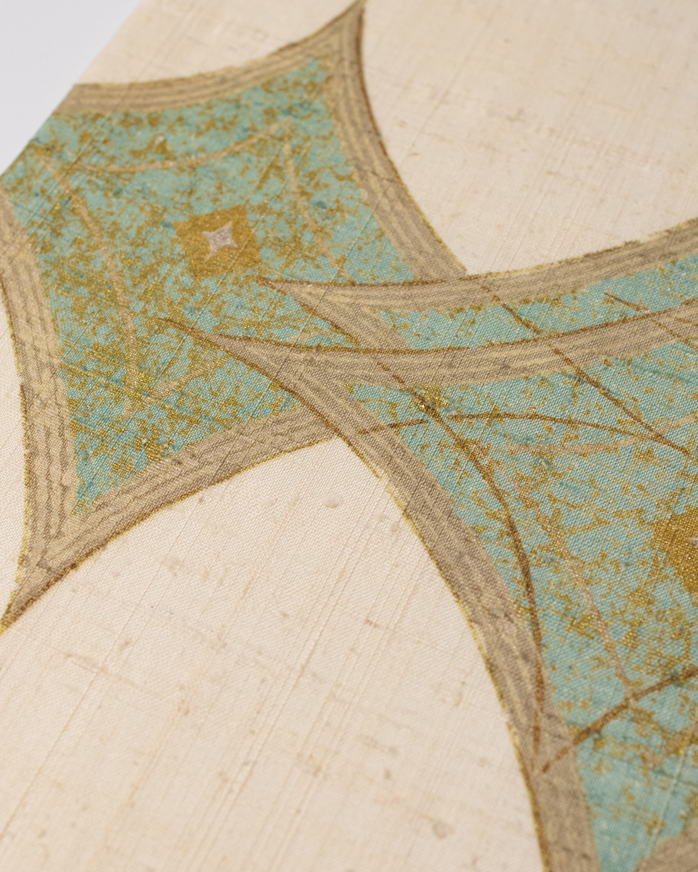 練色のざっくりとした紬地にターコイズ色を基調とした金更紗の変わり菱文様が散りばめられて、染められたエキゾチックな雰囲気の名古屋帯です。