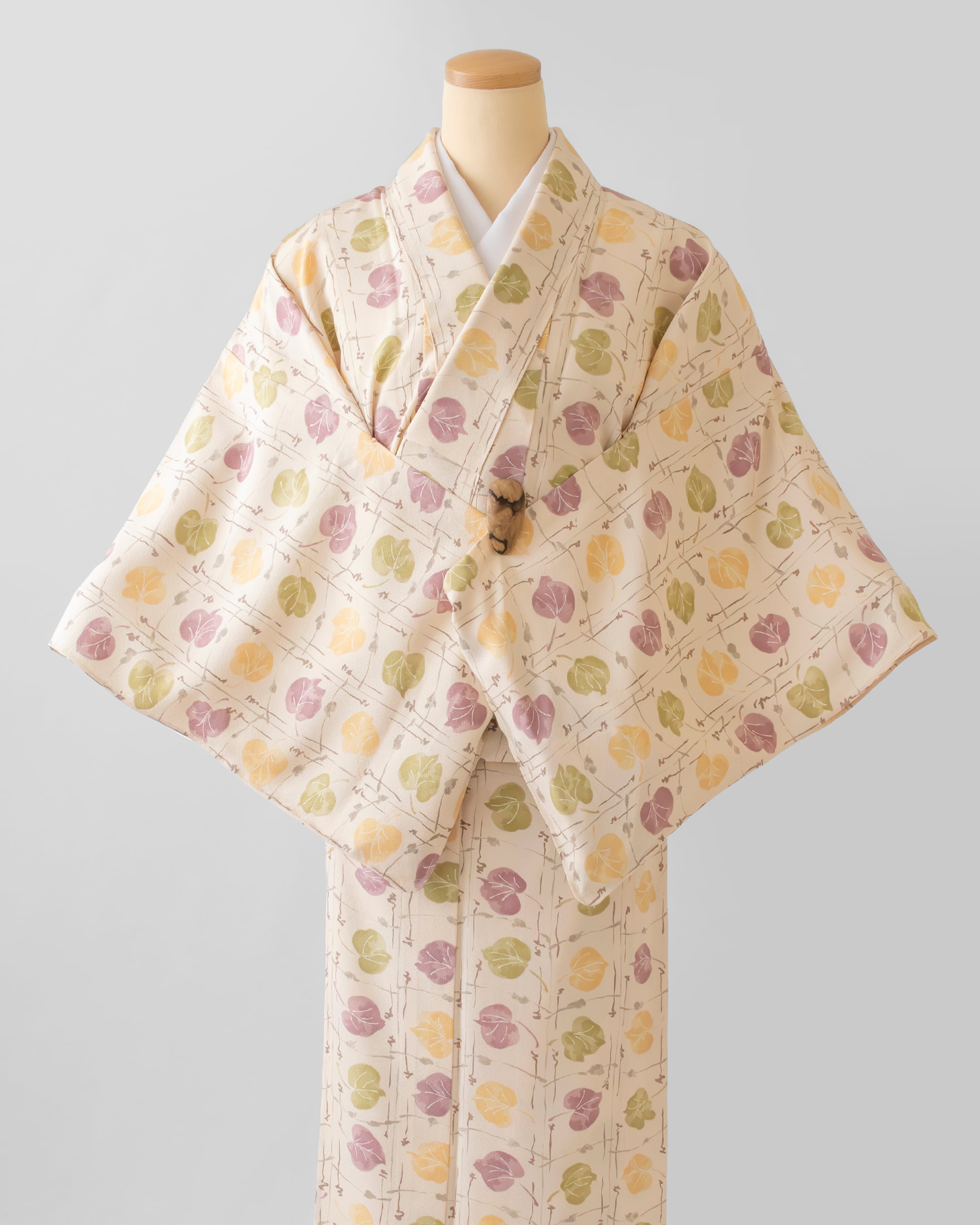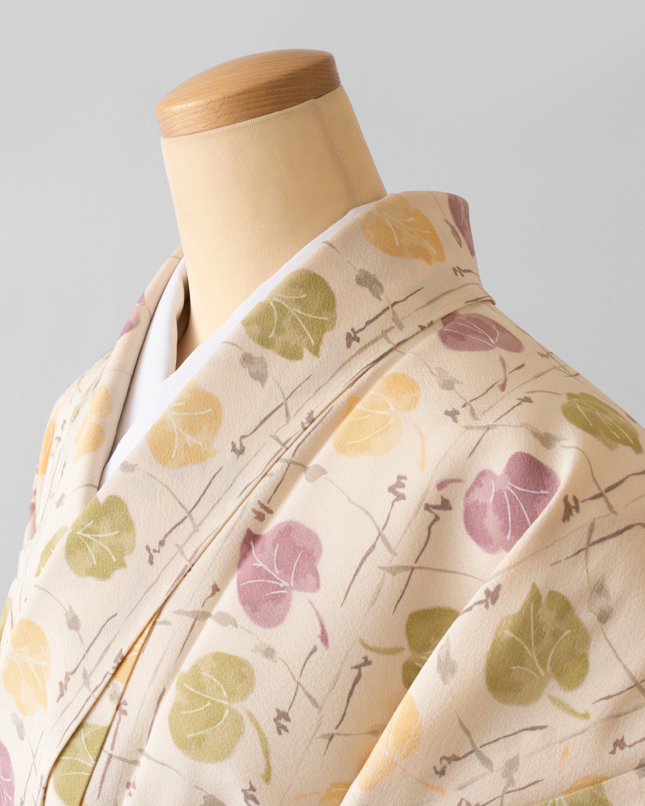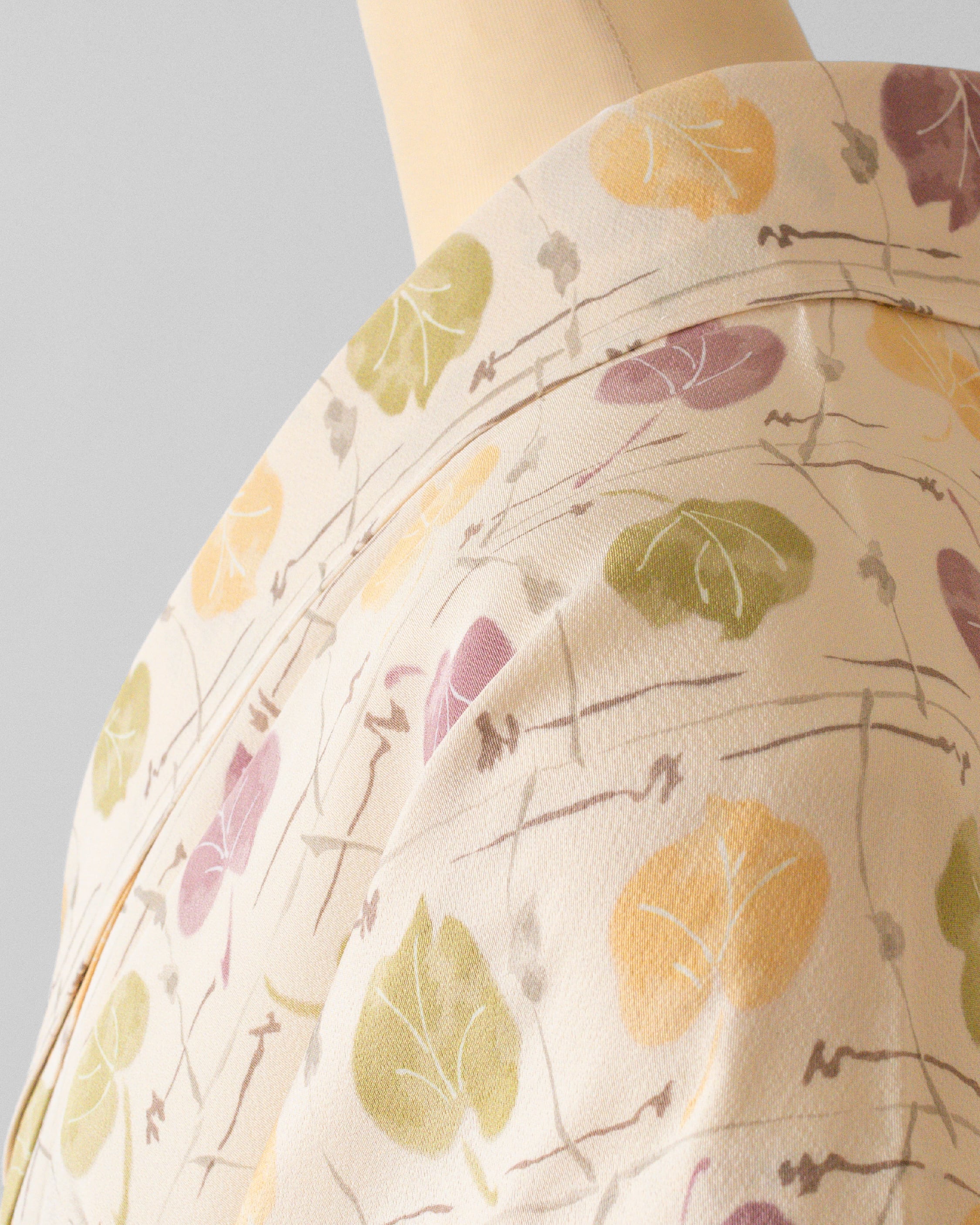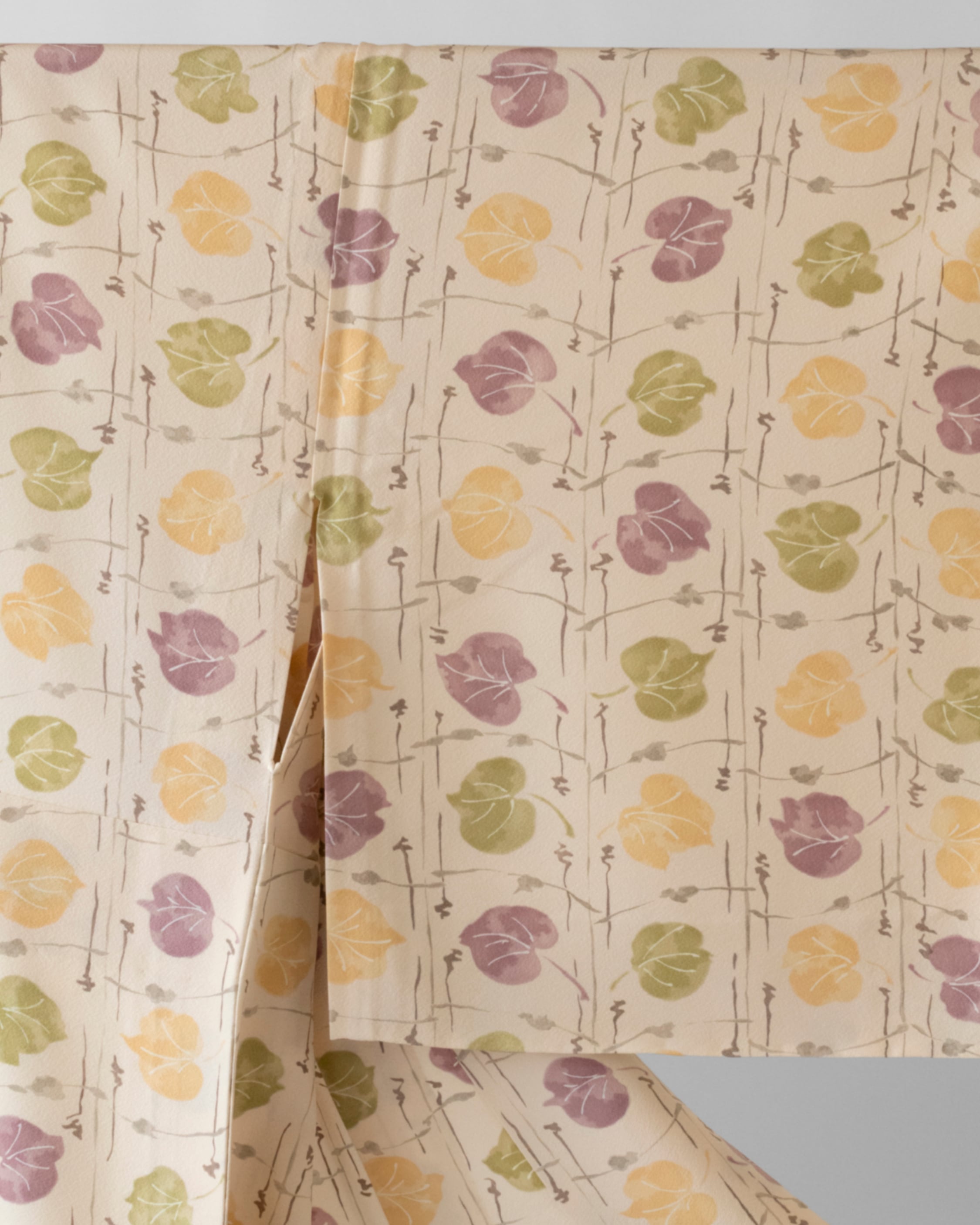 葉っぱ模様の色 草色(暗い黄緑系の色)、支子色(明るい黄系の色)、京紫(鈍い赤紫系の色)