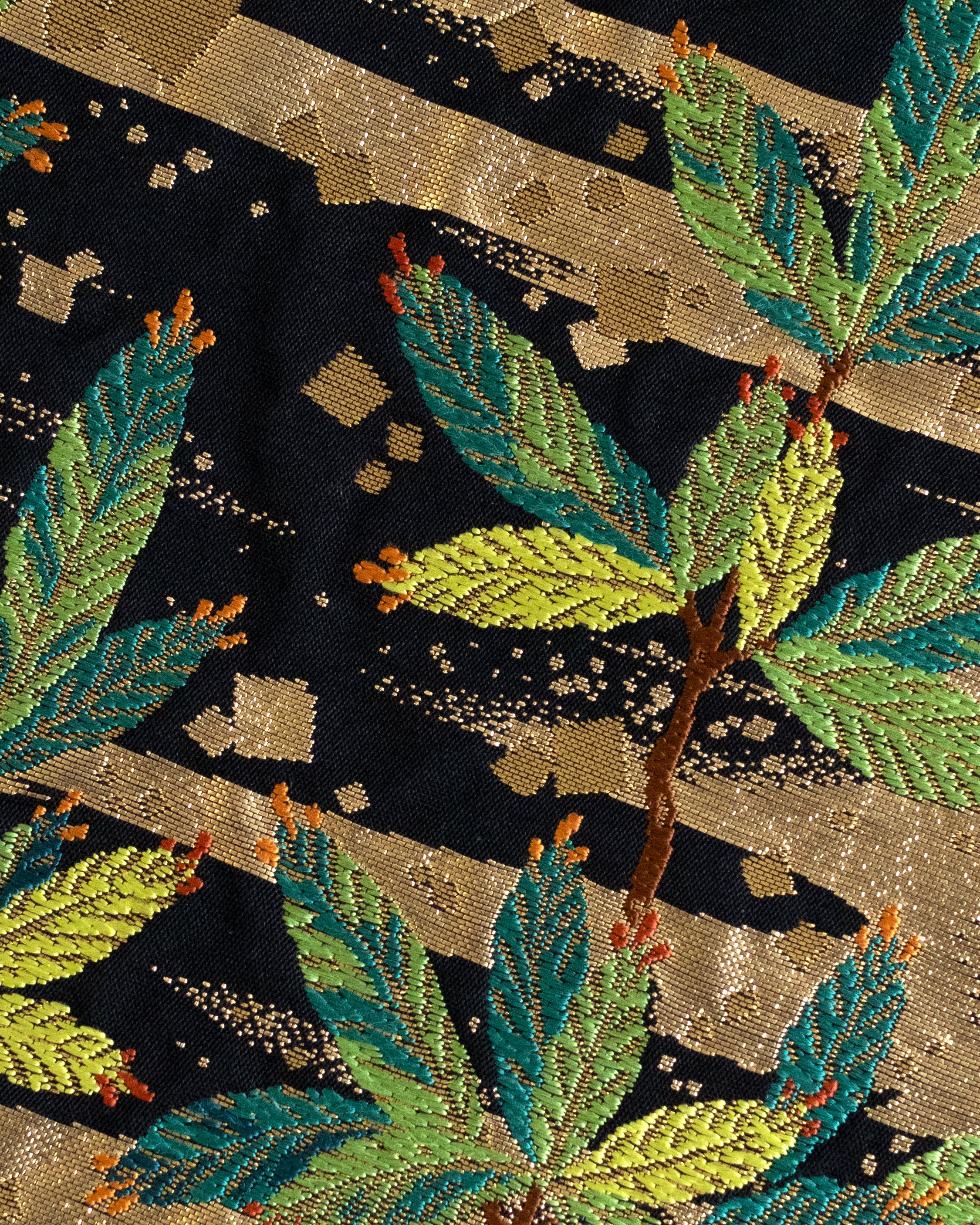 120年以上の長い歴史の中で連綿と受け継がれる独特の個性を表現してこられた龍村さんの帯ですが、現在では「龍村平藏製」と「たつむら製」という2つのブランドがあり、いずれも他では見られないような強い色彩感覚と独特の意匠をボリューム感あふれる織技法で表現されていて、独創性に富んだデザインはお着物ファンを多く魅了しています。